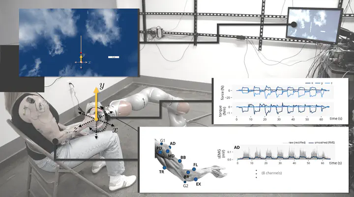 Motor rehabilitation platform enabling detailed measurement of muscle engagement during 6D trajectory tracking tasks.Populations with upper-limb neuromotor disabilities could greatly benefit from robot-mediated therapy, but the heterogeneity of these disorders, combined with unresolved questions around neuroplasticity mechanisms, hinders the standardized prescription of effective rehabilitation tasks and corresponding robot behaviors. Building on consensus that active neuromuscular engagement is vital for therapy, we introduce a novel, extensible rehabilitation robot platform to directly measure (and, ultimately, modify) user engagement at the muscle level. The system integrates surface electromyography to monitor muscle activation patterns during isometric tracking tasks in all 6 dimensions of hand exertion — beyond the planar constraints of most systems. Usability testing with 13 healthy and 2 post-stroke participants demonstrates the system’s utility in analyzing motor behavior across varying poses, trajectories, and impairment levels. Preliminary results indicate that pose and task selection significantly impact activation patterns, highlighting the rehabilitative potential of systems that support motion along all axes and at multiple user poses and guiding our own planned augmentations of the platform (personalized controllers, additional sensing, etc.). To facilitate broader research into muscle activation–force relationships and address the scarcity of open-source upper-limb motor behavior data, we have released all collected data and analysis code as part of the OpenRobotRehab project on SimTK (simtk.org/projects/openrobotrehab) alongside this publication.