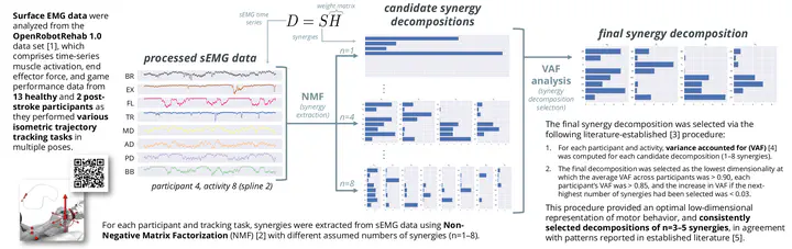 Pipeline for extraction of muscle synergies during isometric rehabilitation exercise, which we then compare across healthy and post-stroke participants.Robot-mediated rehabilitation is a promising approach to motor therapy, but lacks sufficiently granular neuromusculoskeletal models to differentiate pathological individuals. Muscle Synergy Analysis (MSA) provides a low-dimensional but comprehensive representation of motor behavior, and is thus a promising framework with which to examine the differences across healthy and pathological individuals.