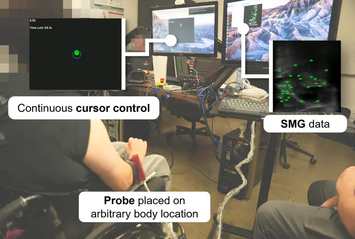 System enabling continuous cursor control from SMG data collected from arbitrary sensor locations.Sonomyography (SMG) enables continuous device control via ultrasound-measured muscle deformation signals, but existing SMG interfaces generally require substantial user- and sensor-location-specific training data and provide only one proportional signal or task-specific classification. We present a real-time, sensor-placement-agnostic SMG control system based on sparse optical flow tracking that enables continuous 1-DOF control after minimal calibration (3 pose definitions). We also present a preliminary expansion of this method that augments this algorithm with a short computer-aided calibration to enable 2-DOF control. We evaluate both 1- and 2-DOF systems’ performance for a preliminary cohort of 3 cervical spinal cord injury survivors and 6 uninjured individuals across 6 sensor placements spanning the arm, neck, and upper torso. As assessed by a cursor trajectory tracking task, all participants achieved continuous 1-DOF control at all tested sensor locations (even those that relied on passive tissue motions), with all participants achieving <5.5% tracking error using at least one placement (and many <4% across many). All participants were also able to modulate 2D cursor position via the 2-DOF system, with varying levels of control authority, and several were able to complete a 2D drawing task, constituting the first (to our knowledge) demonstration of multi-DOF continuous SMG-based control. These results highlight the promise of SMG to enable high-dimensional, sensor-placement-agnostic device control by users with tetraplegia, and also illuminate key challenges in both signal processing and practical system deployment. To enable further development by scientific and user communities, developed algorithms have been open-sourced.